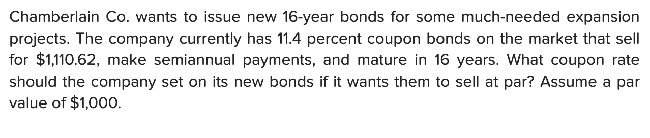 Answered: Chamberlain Co. wants to issue new… | bartleby A: Assuming Face value of bond = 100 Price of bond = 100 = Par value Coupon = Coupon Rate / 2 × Par… Q: The henderson company's bonds currently sells for $1375. They pay a $120 annual coupon and have a… 11 chamberlain co wants to issue new 18 year bonds - Course Hero View full document. 11.Chamberlain Co. wants to issue new 18-year bonds for some much-needed expansion projects. The company currently has 10 percent coupon bonds on the market that sell for $1,075, make semiannual payments, and mature in 18 years. What coupon rate should the company set on its new bonds if it wants them to sell at par? Finance 300 Exam 2 Flashcards - Quizlet Heginbotham Corp. issued 15-year bonds two years ago at a coupon rate of 7.9 percent. The bonds make semiannual payments. If these bonds currently sell for 109 percent of par value, what is the YTM? N = 26 I/Y = ? PV = 1090 PMT = 79/2 FV = 1000 I/Y = 3.422 You find a zero coupon bond with a par value of $10,000 and 19 years to maturity.
